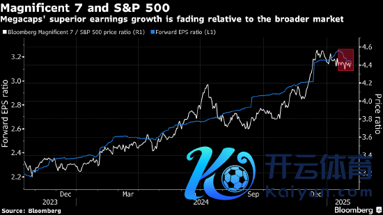 从远期市盈率来看,七巨头比标普500指数全体溢价40%,因此这些担忧对其高估值组成恫吓。这一溢价水平也曾在收窄,低于2023年70%的峰值。
