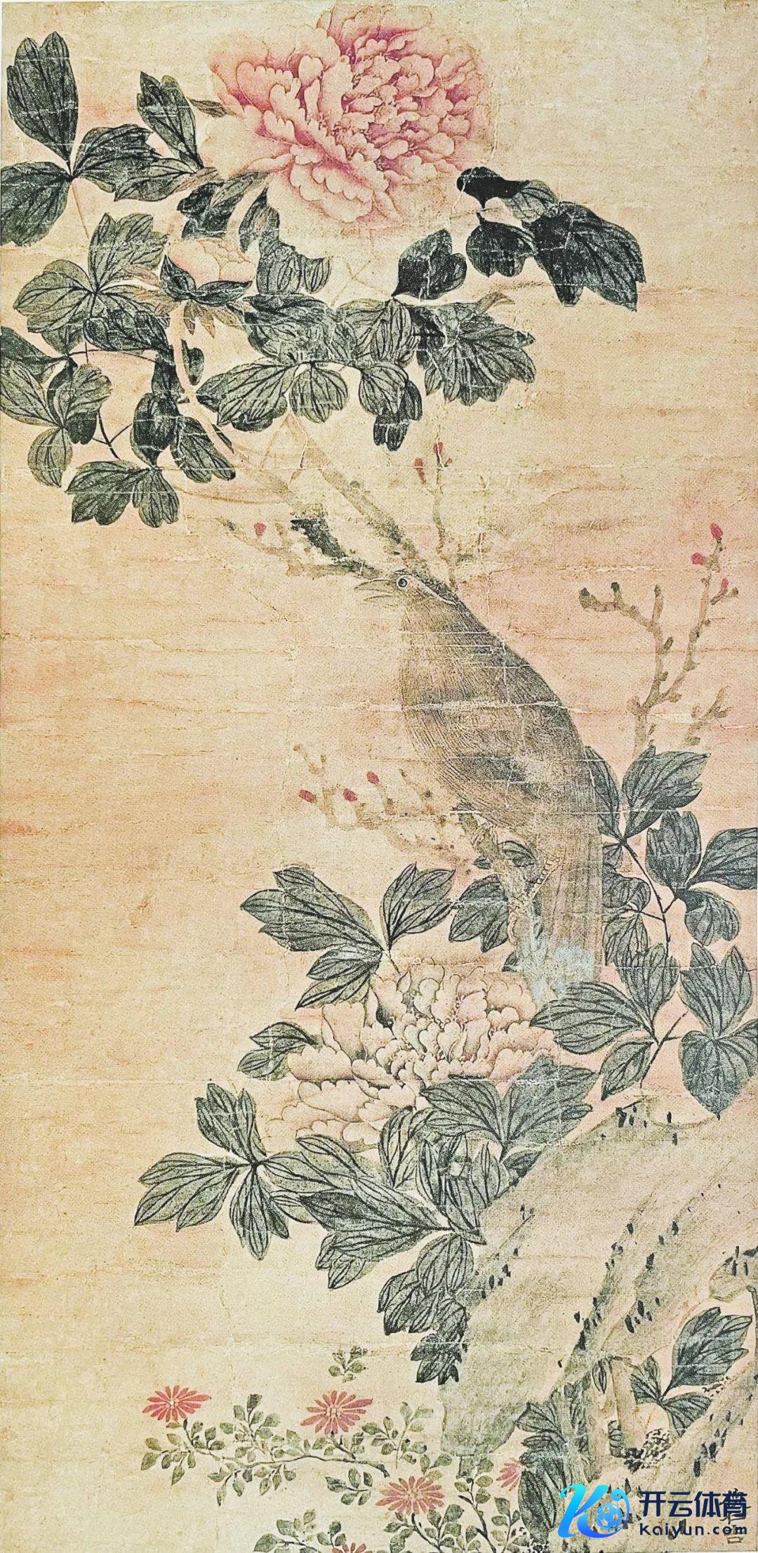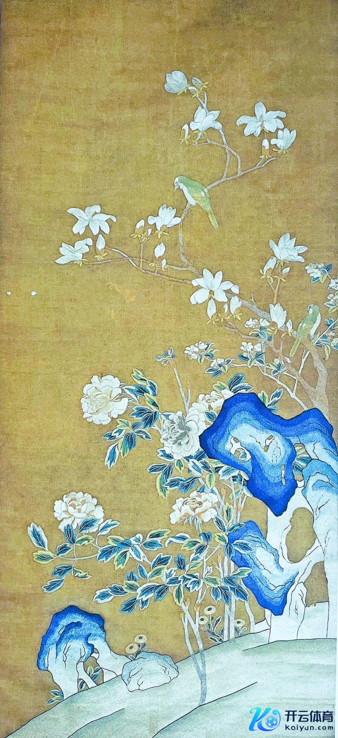 3、丝绣《春昌盛图》,现藏义乌市博物馆。175×76㎝,此图以绫为本,配以各色丝线,绣出山石、牡丹、白玉兰。