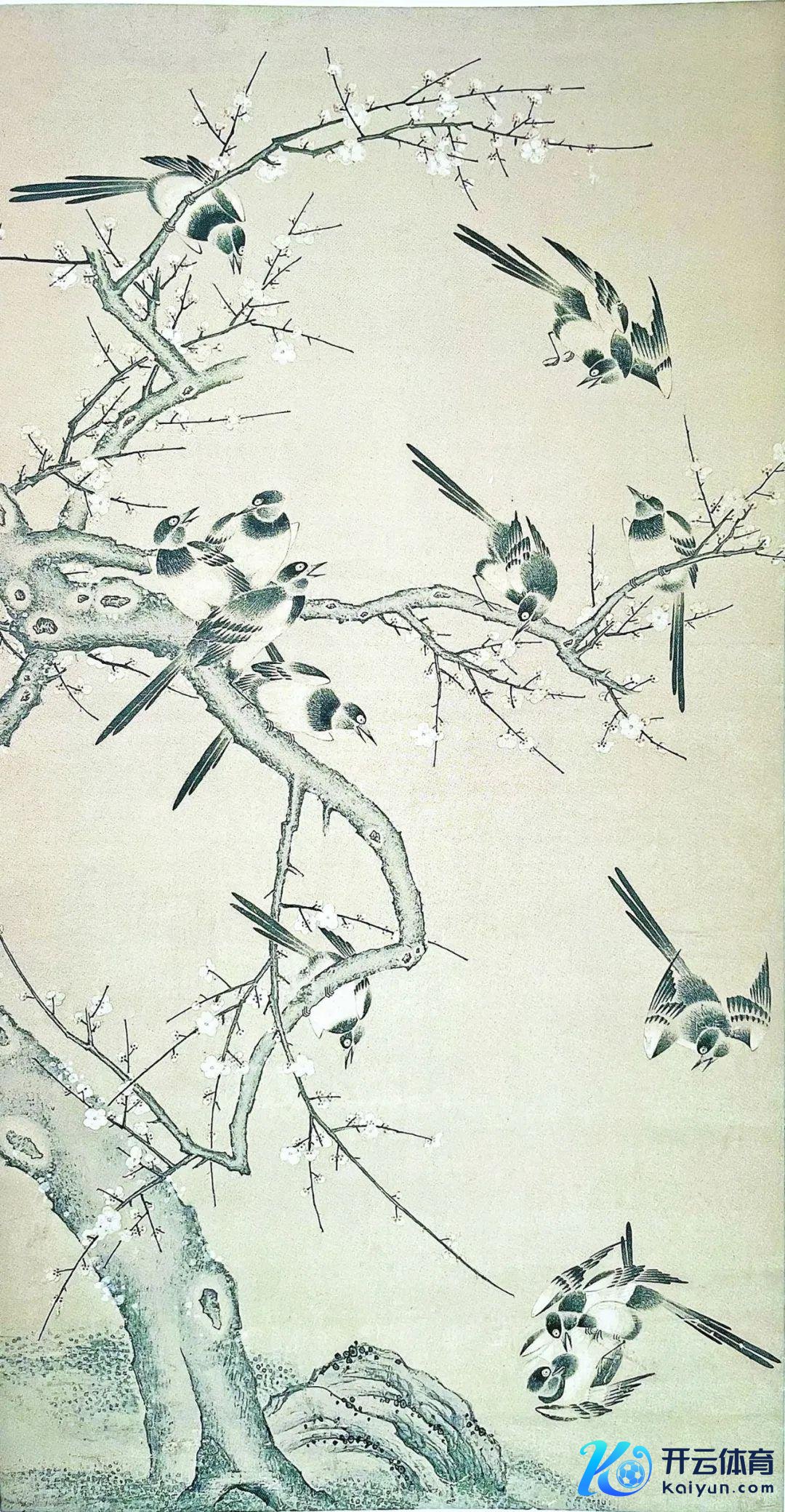 5、画:梅鹊图轴,133×69.5㎝,此画精绘梅枝和喜鹊,工笔,但非双勾,以墨色的浓浅色没骨写出,用笔工整。现藏义乌市博物馆。